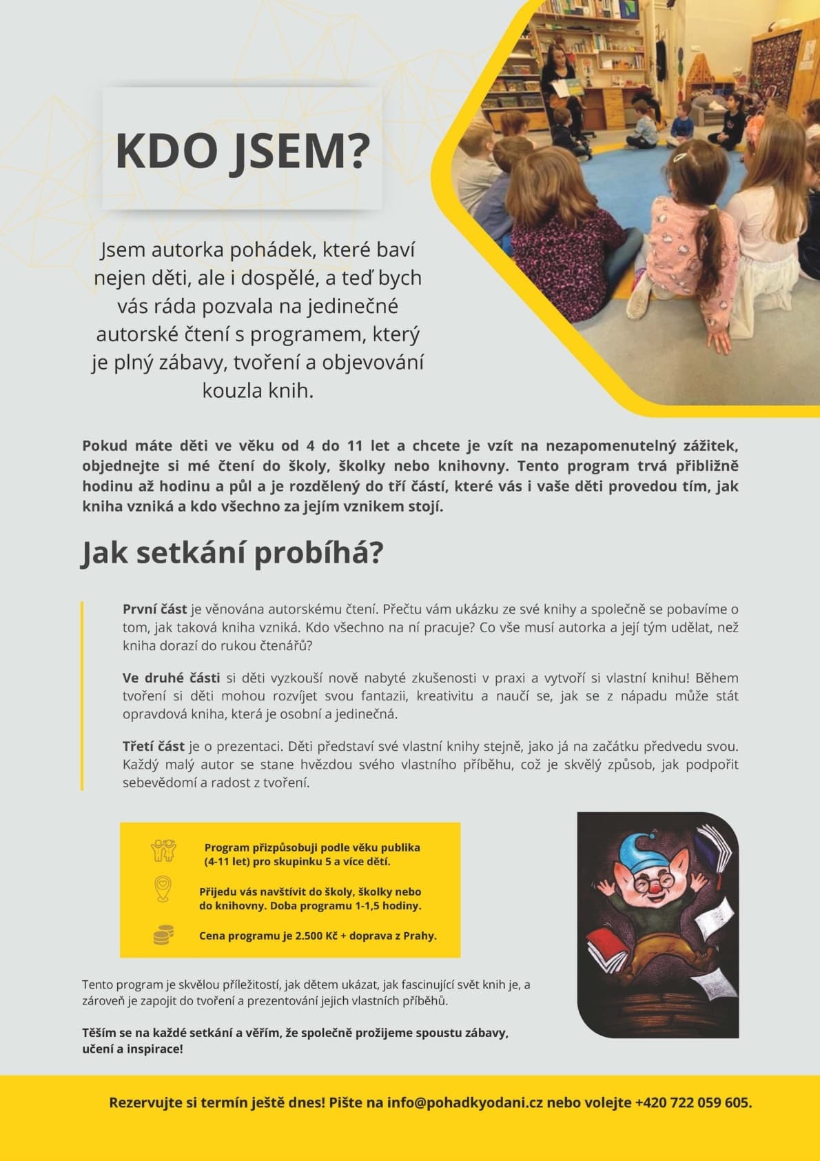 Program probíhá ve škole/školce/knihovně, pro věk 4–11 let, trvá cca 60–90 minut. Cena je 2 500 Kč + doprava z Prahy. Rezervace a další informace jsou na webu Pohádky od Áni.