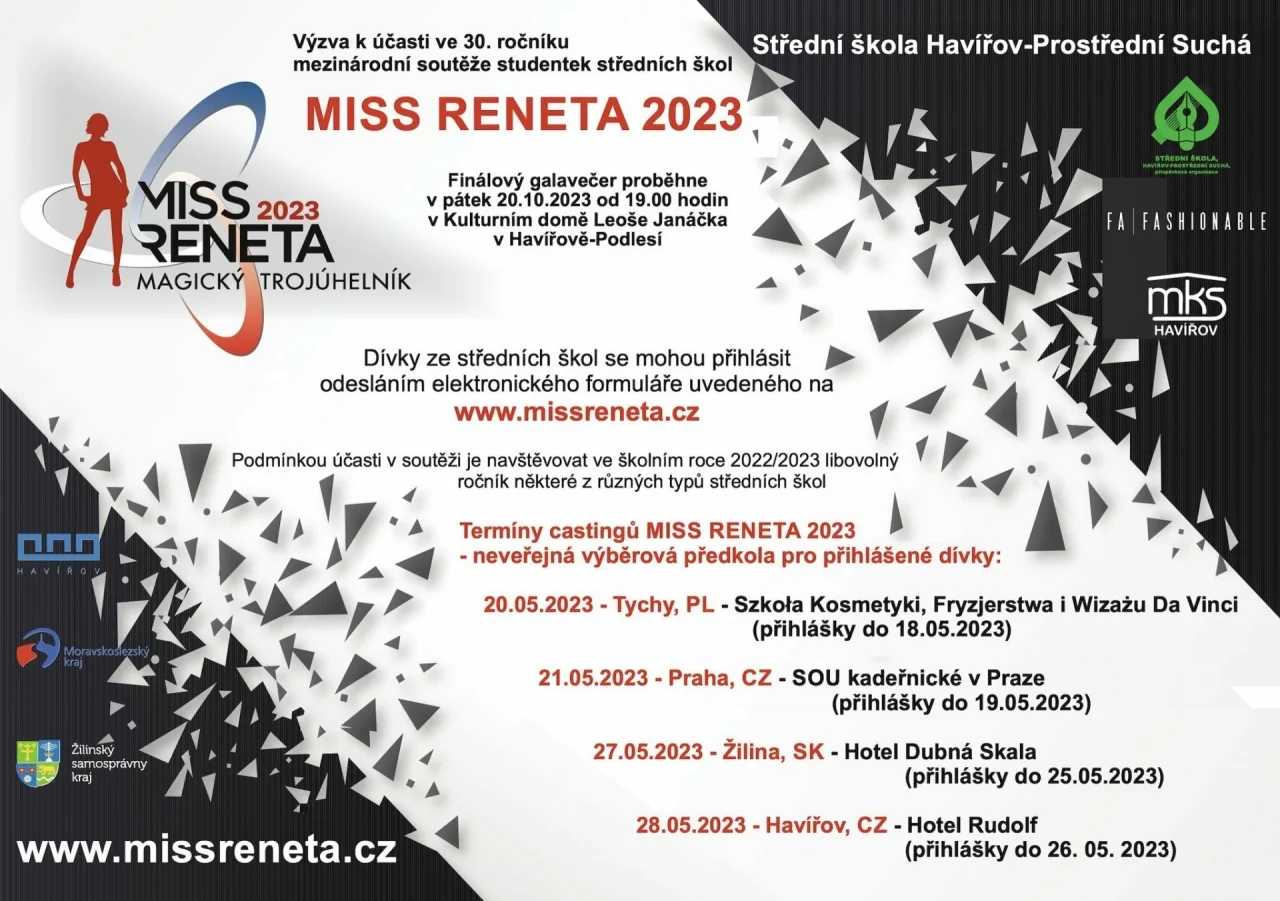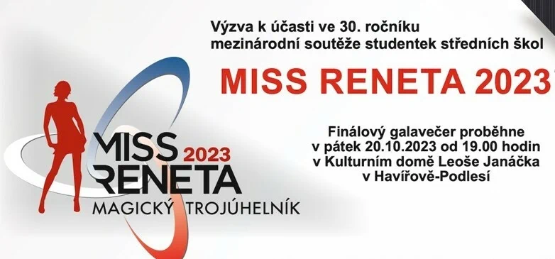 Výzva k účasti ve 30. ročníku mezinárodní soutěže studentek středních škol MISS RENETA 2023 Magický Trojúhelník. Dívky ze středních škol se mohou přihlásit odesláním elektronického formuláře.