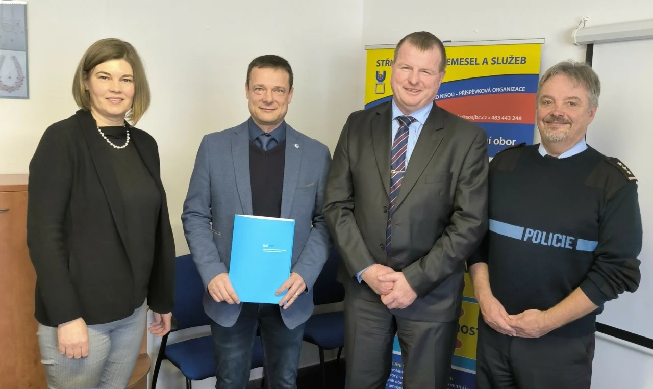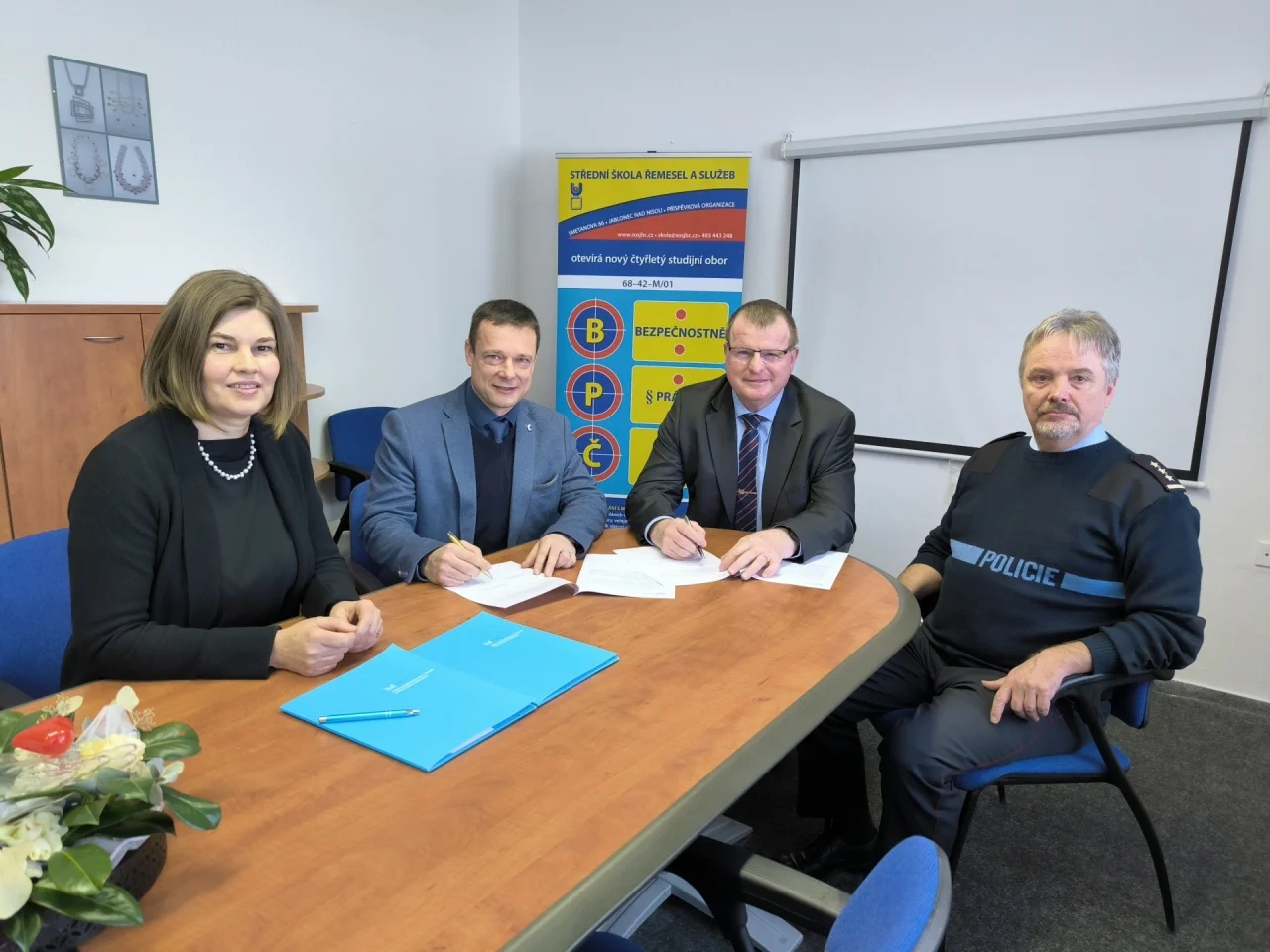 S radostí oznamujeme, že ředitel Střední školy řemesel a služeb Jablonec nad Nisou Mgr. Martin Kubáč uzavřel s Ministerstvem vnitra v zastoupení s Ing. Bc. Luďkem Michálkem Ph.D. ředitelem odboru bezpečnostního výzkumu a policejního vzdělávání dohodu, která je nedílnou součástí otevření nového prestižního studijního oboru 68-42-M/01 Bezpečnostně právní činnost. Tento obor je navržen tak, aby poskytl studentům špičkové vzdělání a praktické dovednosti potřebné pro budování úspěšné kariéry v oblasti bezpečnostních sborů a složek IZS. Uzavření dohody byla přítomna Ing. Arch. Jitka Skalická radní pro školství za Liberecký kraj a plk. Mgr. Pavel Bartoš náměstek ředitele pro vnější službu Krajského ředitelství policie Libereckého kraje.