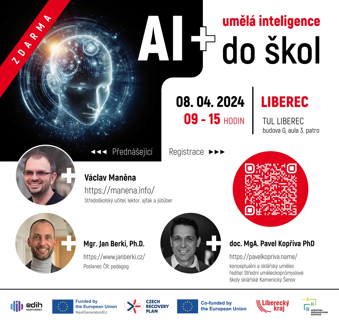 Pod záštitou Libereckého kraje panem radním Jiřím Ulvrem zavítá umělá inteligence 8.4.2024 do Liberce. Poznejte šikovné nástroje AI a jak je snadno využít ve výuce vašeho předmětu. Těšit se můžete i na bohatý doprovodný program.