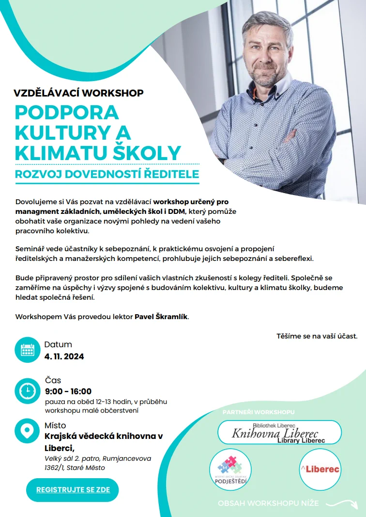 dovolujeme si vás pozvat na vzdělávací workshop pro ředitele a vedoucí pracovníky základních, základních uměleckých škol a DDM na téma: Podpora kultury a klimatu školy, rozvoj dovedností ředitele.