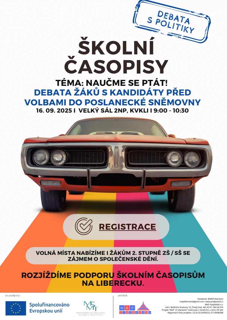 dovolujeme si Vás a Vaše žáky pozvat na vzdělávací debatu se zástupci politických stran kandidujících do PS s aspirací mluvit do školství. Debatu pořádáme v rámci projektu MAP IV Liberecko. Smyslem akce je poskytnout žákům platformu, kde se budou moci svobodně ptát a diskutovat na jimi preferovaná témata. K dispozici bude i zkušený moderátor a online kladení dotazů.