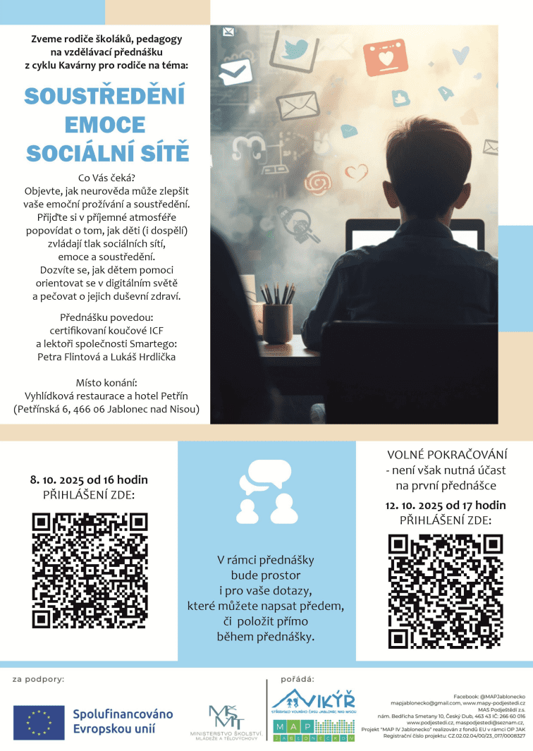 zveme Vás na vzdělávací přednášku z cyklu Kavárny pro rodiče na téma: SOUSTŘEDĚNÍ – EMOCE – SOCIÁLNÍ SÍTĚ