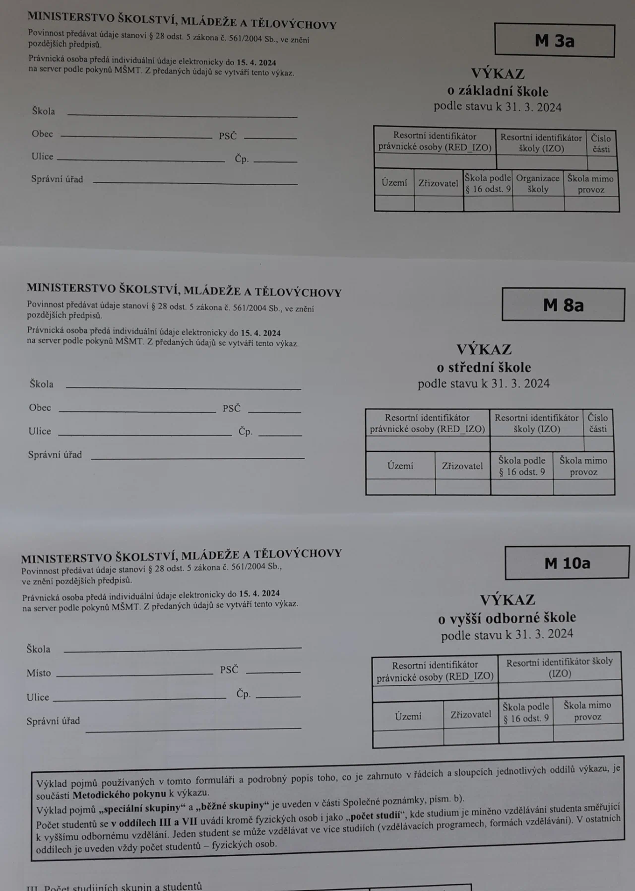 Dle vyhlášky č. 364/2005 Sb., vyhláška o dokumentaci škol a školských zařízení, se „agregované údaje ze školních matrik a dokumentace škol a školských zařízení předává právnická osoba vykonávající činnost školy nebo školského zařízení, příslušnému správnímu úřadu na výkazech elektronicky. Ředitel školy nebo školského zařízení potvrdí správnost údajů a bez zbytečného odkladu je odešle na vědomí ministerstvu, je-li škola nebo školské zařízení zřizované ministerstvem, nebo obecnímu úřadu obce s rozšířenou působností, je-li škola nebo školské zařízení zřizované obcí nebo svazkem obcí, nebo krajskému úřadu, jde-li o ostatní školy a školská zařízení.“