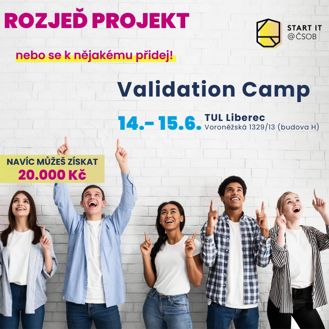 Ve dnech 14.-15.6.2024 proběhne na TUL Validation Camp pořádaný Start it @UNI - ČSOB pro středoškolské a vysokoškolské studenty. Cílem celého Start it @UNI programu je pomocí zážitkového vzdělávání naučit studenty ověřovat poptávku svého projektu nebo zatím i jenom myšlenky projektu na trhu, aby mohli najít a budovat takové projekty, které budou jejich zákazníci ochotni kupovat. Tím chceme minimalizovat rizika a zvyšovat jejich šanci na úspěch a tím i chuť do podnikání.