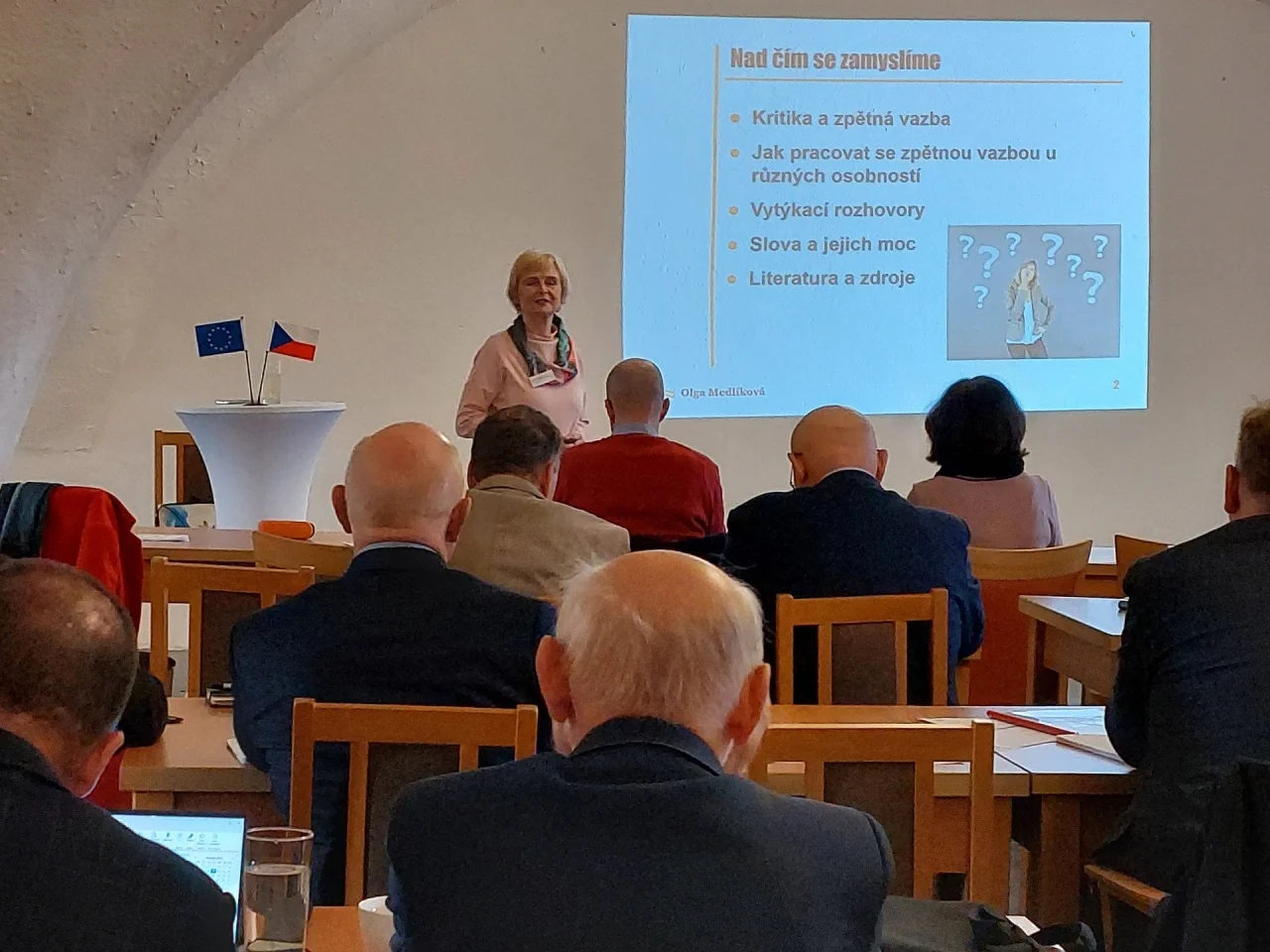 Dopolední část čtvrtečního programu obsahovala aktuální informace z projektu KAP LK II a NAKAP LK II, včetně informací z projektu Podpora akčního plánování v podaní paní Mgr. Gabriely Samšiňákové. Realizační tým KAP LK II, který byl zároveň realizátorem tohoto workshopu, využil čas během prezentace mimo jiné i ke zjištění dalších informací týkajících se cílů KAP LK III. a preferencí ředitelů ohledně budoucích aktivit RT KAP. Dopolední program dále doplnila paní PaedDr. Olga Medlíková se svým seminářem na téma kritika a zpětná vazba, která měla u ředitelů