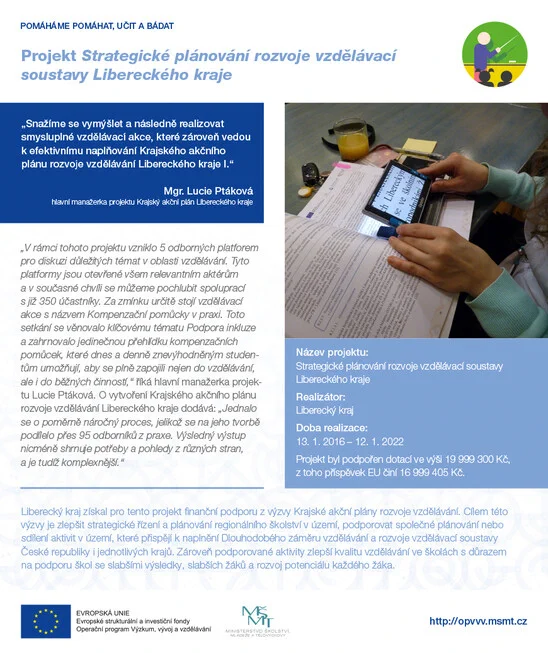 Operační program Výzkum, vývoj a vzdělávání představuje další podpořený projekt. Tentokrát se jedná o projekt Libereckého kraje "Strategické plánování rozvoje vzdělávací soustavy Libereckého kraje", který je realizován ve výzvě Krajské akční plány rozvoje vzdělávání.