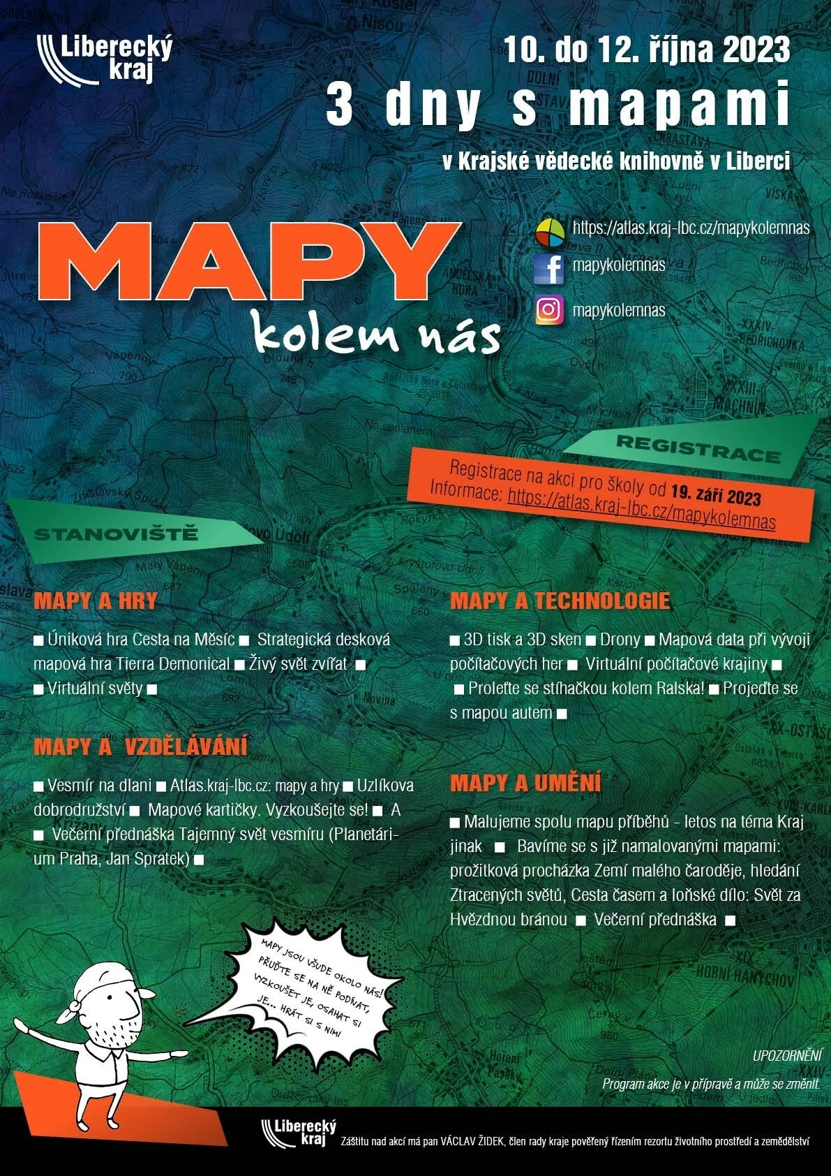 Registrace pro školy bude zahájena dne 19. 9. 2023 od 7:30. Budeme o ní opět informovat emailem s uvedením konkrétnějšího obsahu a také zde na stránkách akce. Rozpis bloků je zde: https://1url.cz/@mapykolemnas2023.
