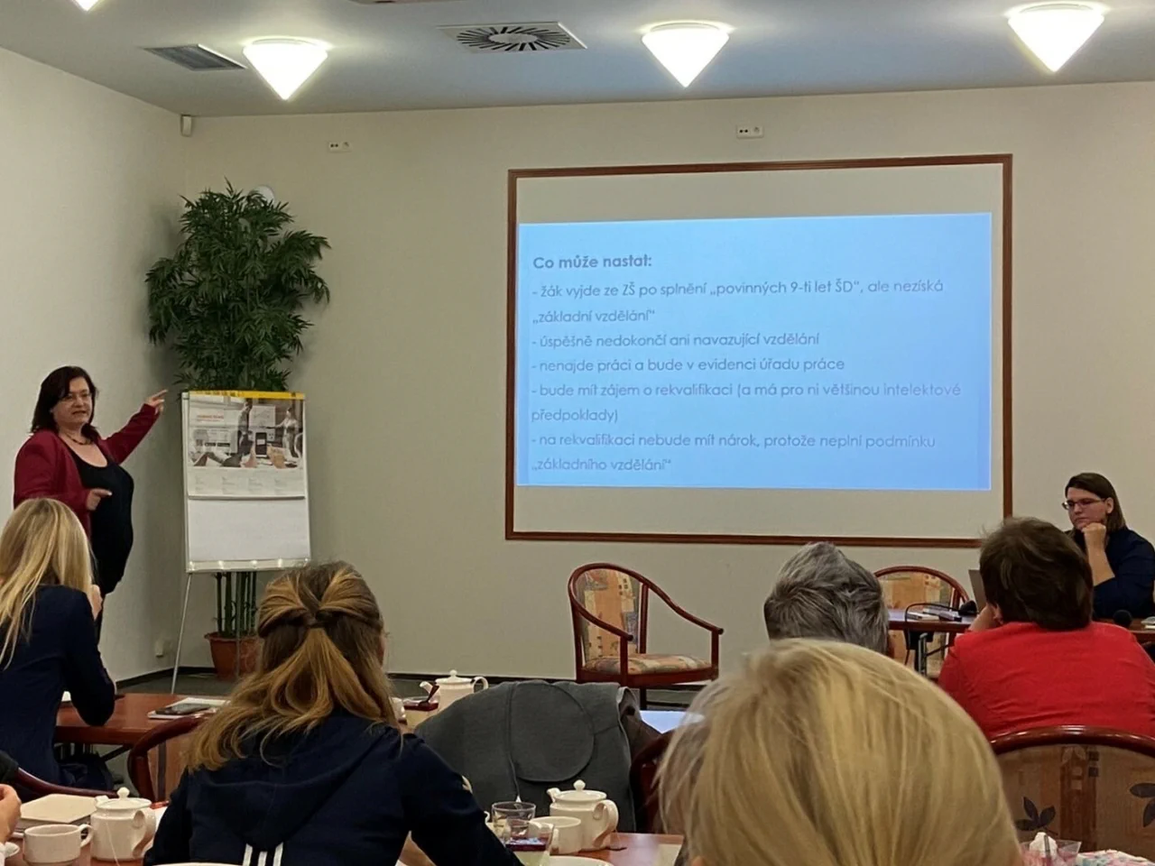 Ve druhé části programu proběhlo sdílení zkušeností z činnosti pedagogicko-psychologické poradny Česká Lípa. Zaměstnankyně poradny se zaměřily na žáky s hraničním intelektem, kteří tzv. stojí mimo systém a možnosti inkluze a jsou nejvíce ohroženy školním neúspěchem a na žáky s LMP v režimu inkluze do běžných tříd ZŠ.
