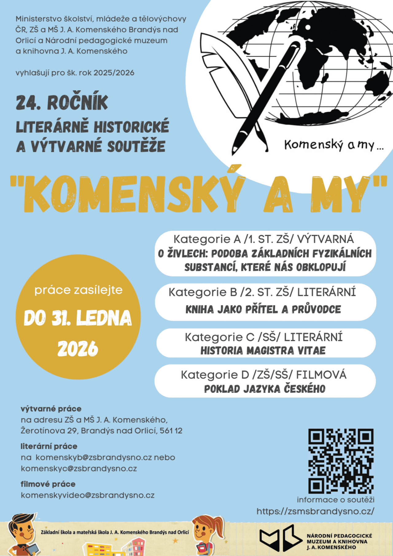 Ministerstvo školství, mládeže a tělovýchovy ve spolupráci s Národním pedagogickým muzeem a knihovnou J. A. Komenského a Základní školou a mateřskou školou J. A. Komenského Brandýs nad Orlicí vyhlašuje pro děti a mládež 24. ročník celostátní literárně historické a výtvarné soutěže pro děti a mládež “KOMENSKÝ A MY” pro školní rok 2025 - 2026.