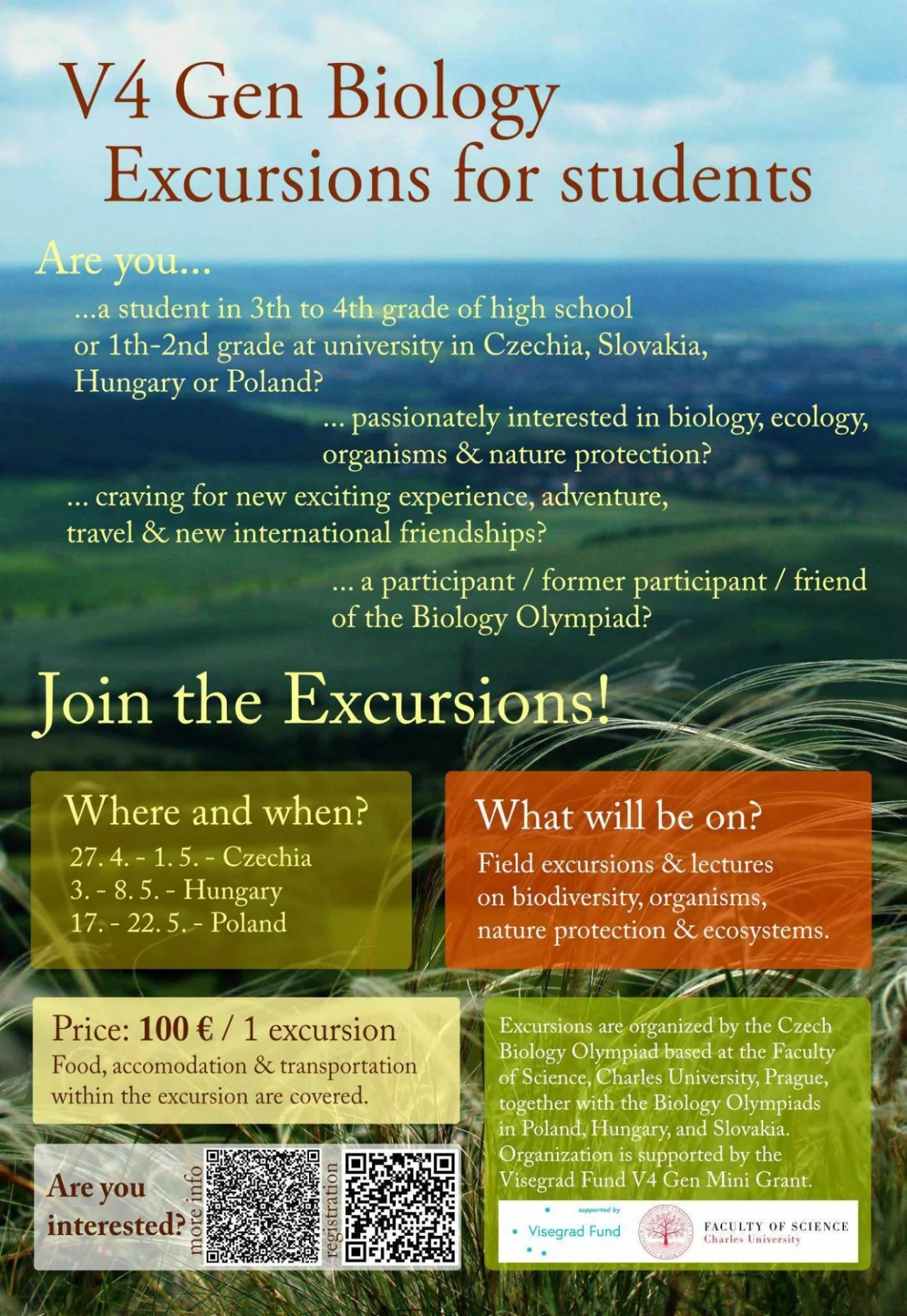 Katedra Učitelství a didaktiky biologie Přírodovědecké fakulty Univerzity Karlovy nabízí žákům 3. a 4. ročníků středních škol, příp. studentům 1. a 2. ročníků vysokých škol, kteří mají hlubší zájem o biologii možnost účasti v exkurzích po zemích Visegrádu.