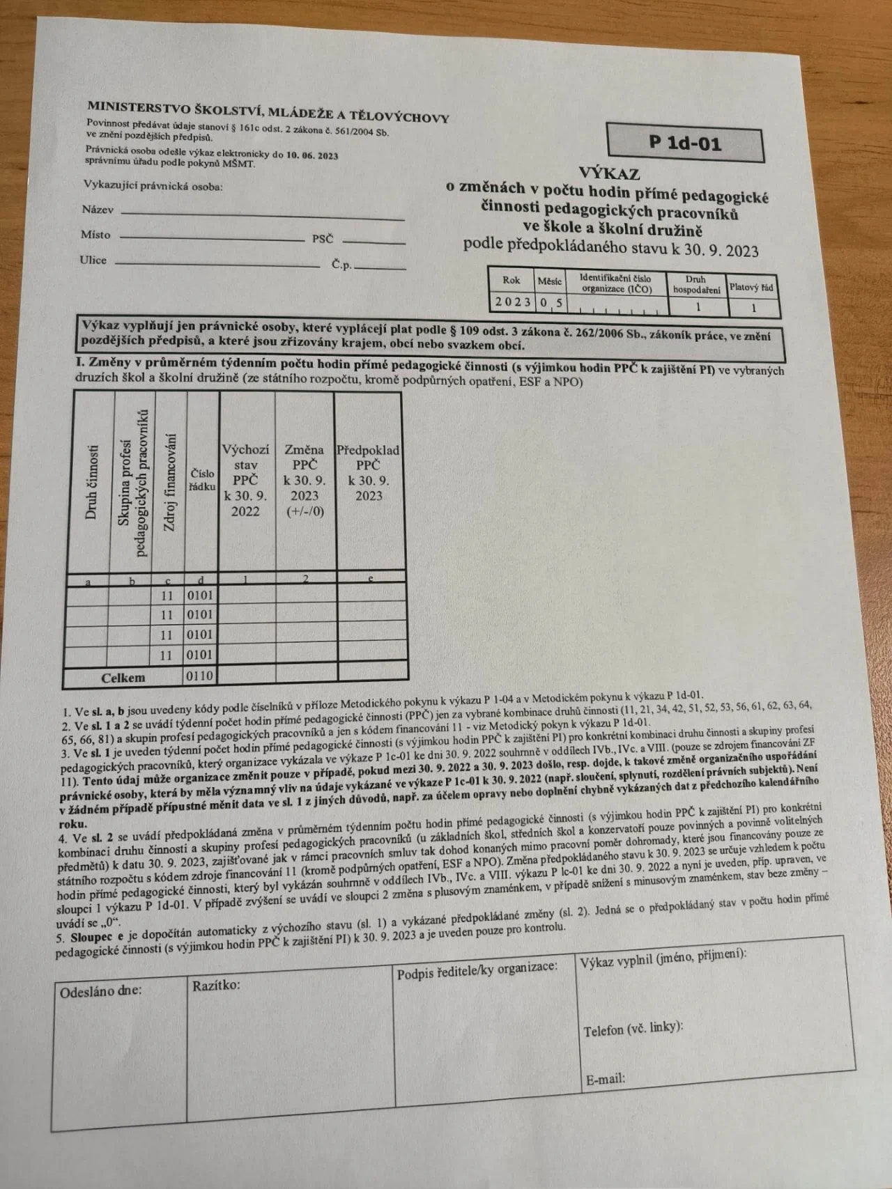 Výkaz P1d-01 vyplňují v souladu s vyhláškou č. 161/2018 Sb. jen právnické osoby, které vyplácejí plat podle § 109 odst. 3 zákona č. 262/2006 Sb., zákoníku práce, ve znění pozdějších předpisů, a které vykonávají činnost mateřské školy, základní školy, střední školy, konzervatoře nebo školní družiny zřizované krajem, obcí nebo dobrovolným svazkem obcí a zapsané v rejstříku škol a školských zařízení. Organizace odesílá výkaz P1d-01 v období od 31. května do 10. června 2023.